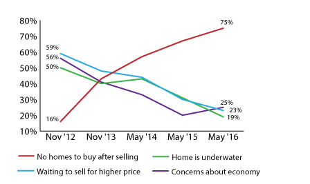 The most dramatic change reflects the continuing challenge of low inventory levels. In 2012, 16 percent of respondents indicated would-be sellers weren't selling because there were no homes to buy after selling their home. The percentage increased 59 points to 75 percent when the same question was asked in 2016.