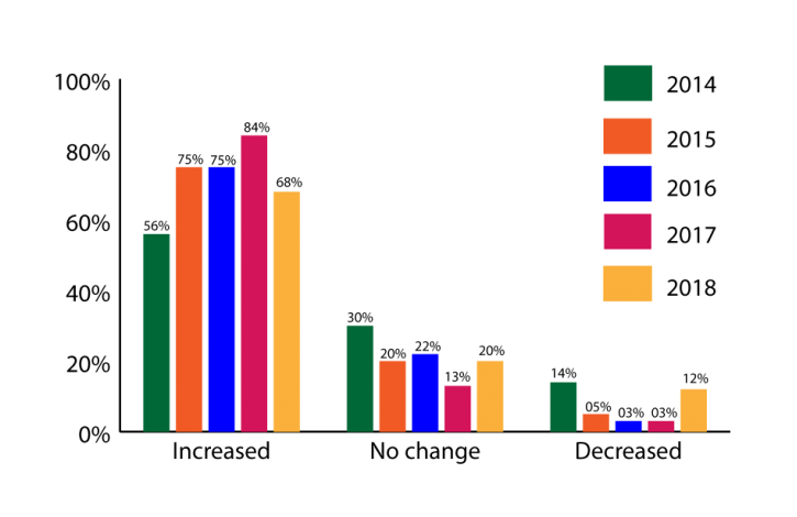 For the first time in four years respondents' are less likely to report that multiple offers in their area are on the increase. The percentage indicating so still reaches 68 percent, but it is less than the 75 percent reported in 2015 and 2016 and much less than the 84 percent reported in October of last year.